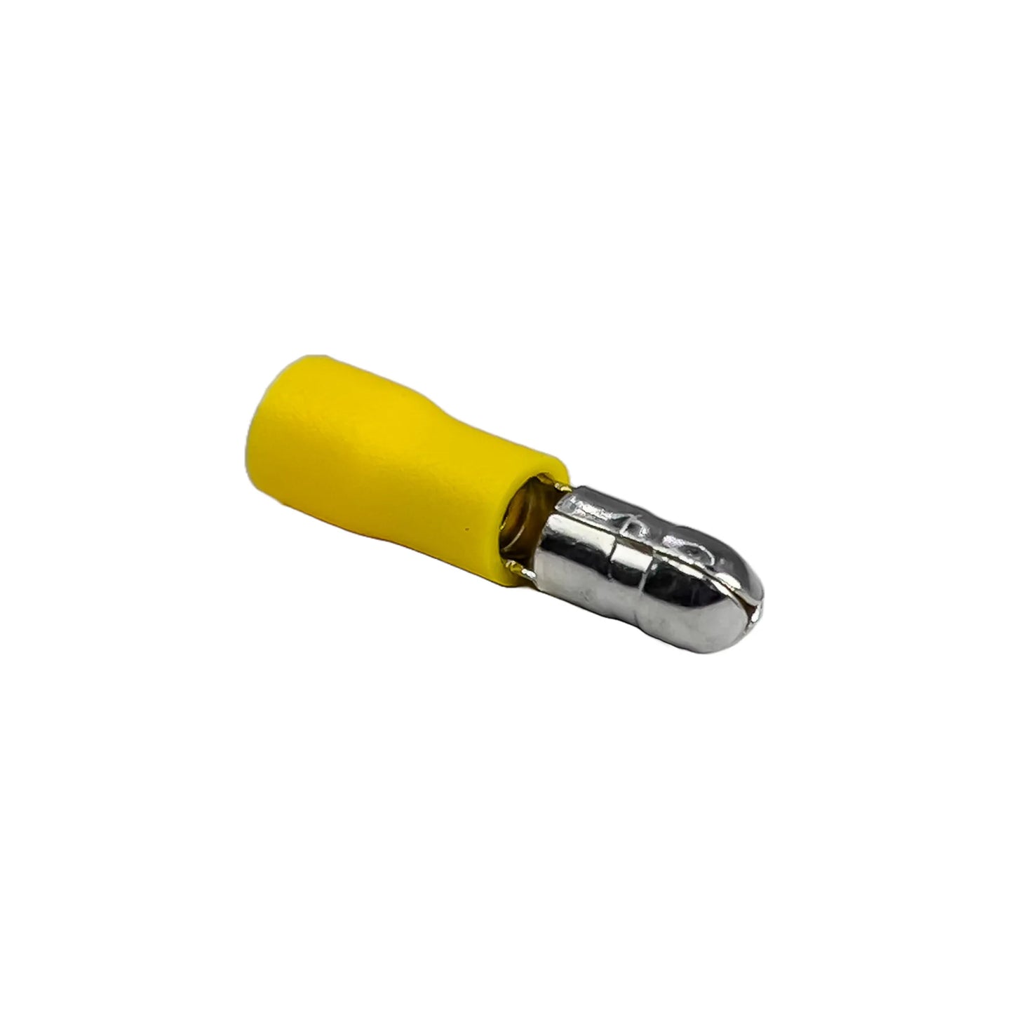 En amarillo. Conector el≈Ωctrico con pasador circular y recubrimiento aislante, Diseñado para insertarse en terminales hembra redondas, asegurando una conexi‚Äîn segura, r‚İpida y protegida en sistemas eléctricos.