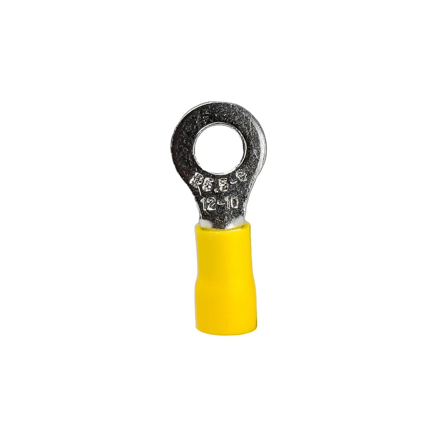En amarillo. Conectores eléctricos con una forma circular o en anillo, Diseñados para fijarse firmemente a tornillos o pernos. Permiten conexiones seguras y estables en cables eléctricos, facilitando la instalación y garantizando una buena conductividad en sistemas eléctricos e industriales.